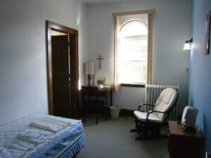 Following the Franciscan tradition, rooms at St. Anthony’s are modestly furnished with a twin size or full bed, a desk with lamp, a sitting chair or rocker, and an electric fan. (Space heaters are available upon request.) Housekeeping provides basic bedding like sheets, pillowcases, and a light top sheet or thin blanket. We recommend that you bring your own comforter or heavier blanket depending on your preference. Our staff also provides a full bath towel, hand towel, wash cloth and disposable plastic cup for your stay.
